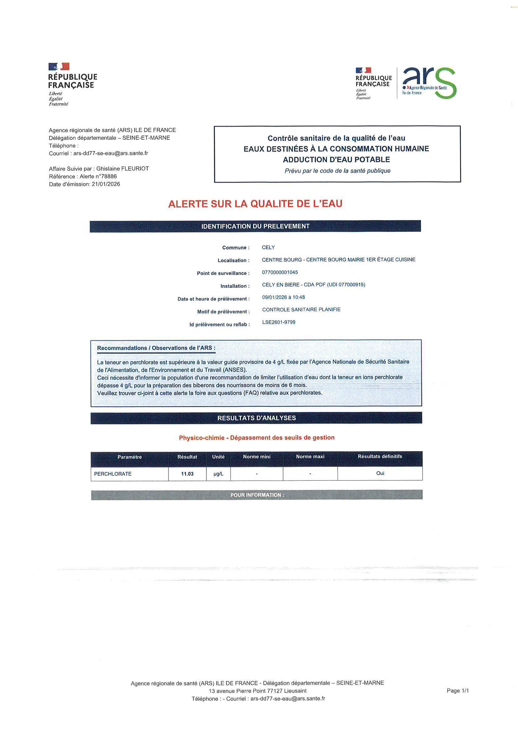 La teneur en perchlorate est supérieure à la valeur guide provisoire de 4g/l fixée par l'Agence Nationale de Sécurité Sanitaire de l'Alimentation, de l'Environnement et du Travail (ANSES).